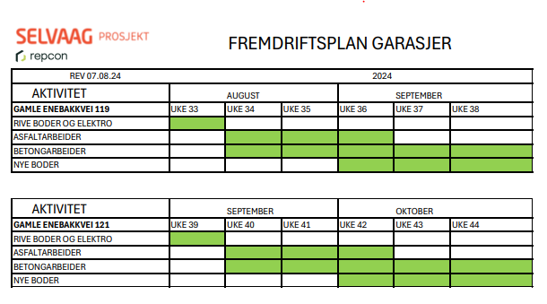 Her er fremdriftsplan for garasjer. Fremdriftsplan garasjer ligger som dokument til nedlastning nederst på forsiden til prosjektet.